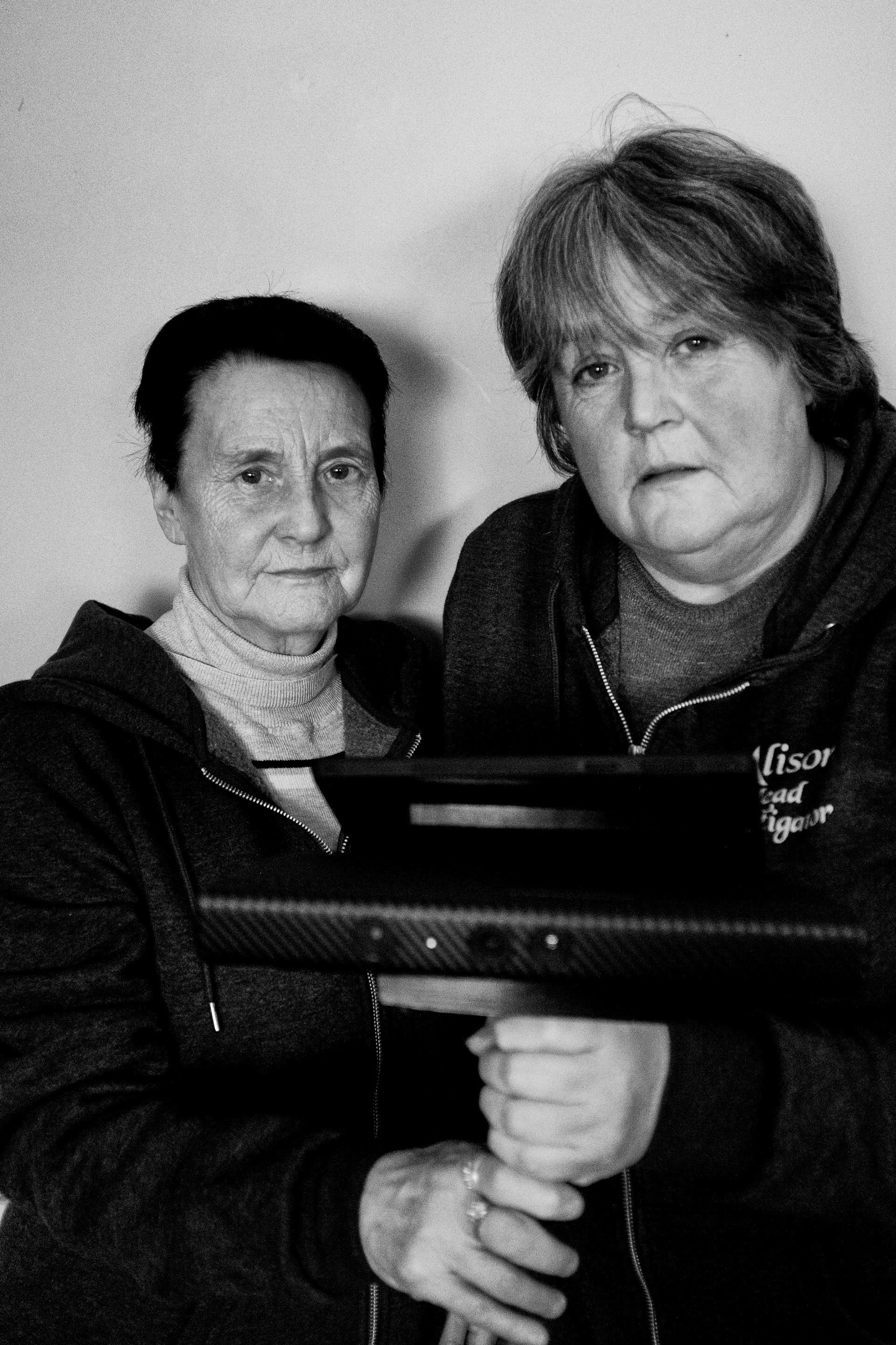 Crystal (a medium) and Alison with a piece of equipment to detect spirits. Image © Jonathan Straight 2021